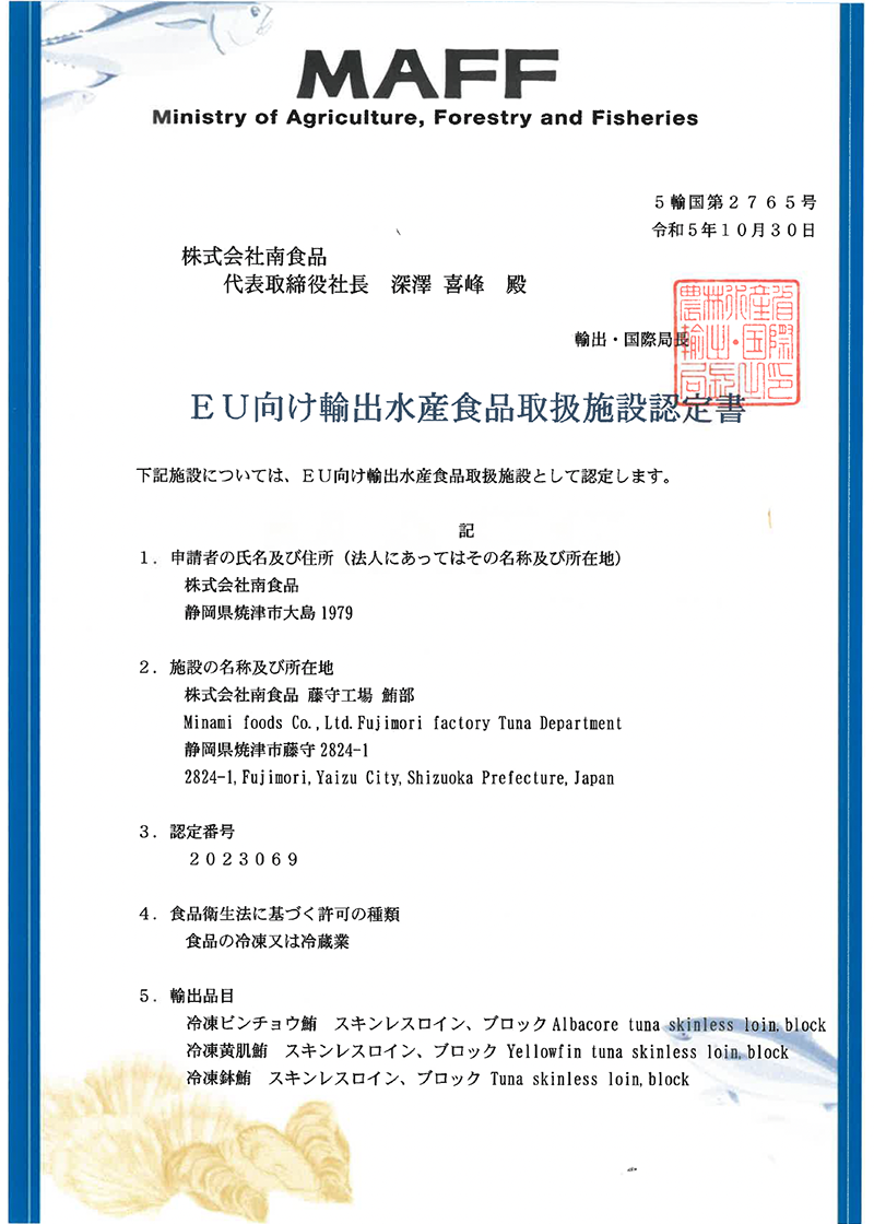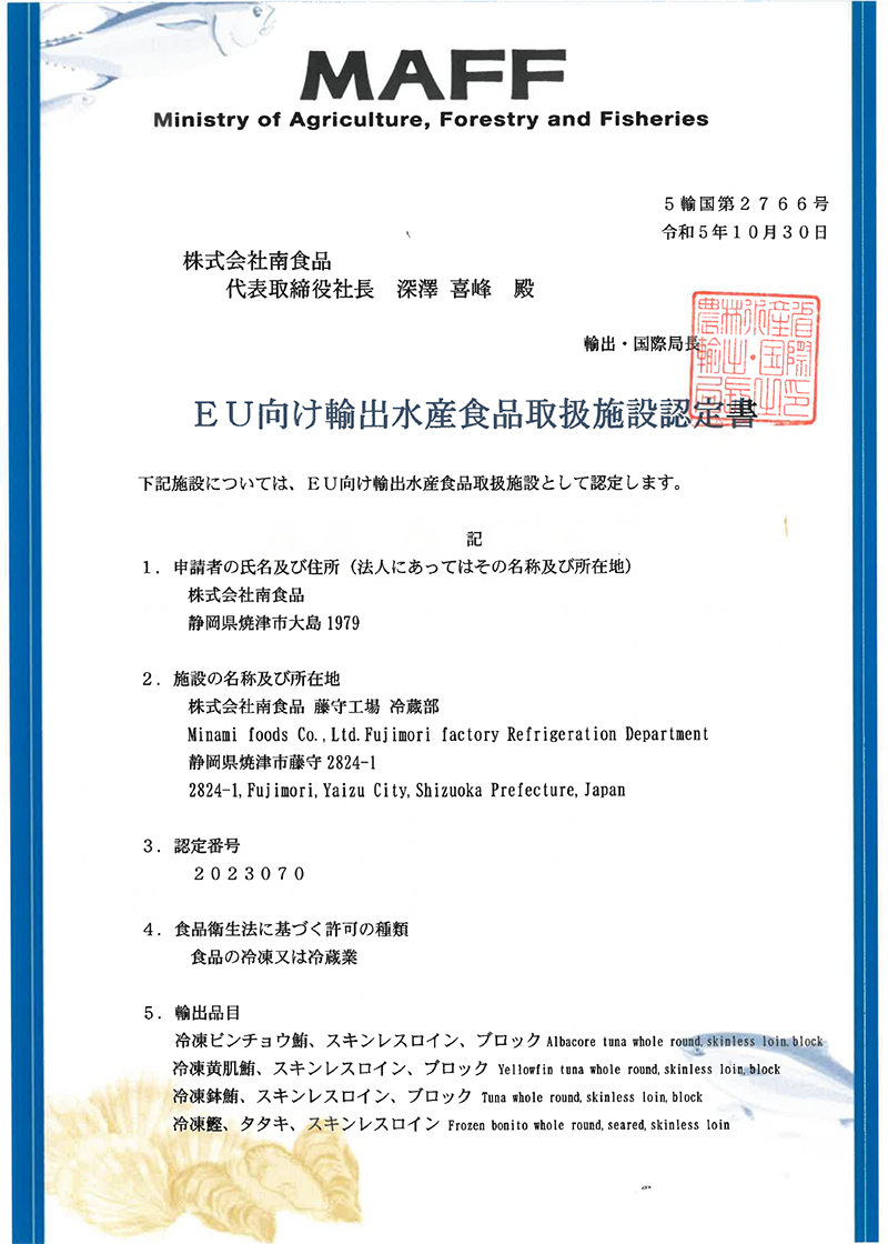 農水省より、「EU向け施設(鮪部・冷蔵部)認定書」が発行されました!