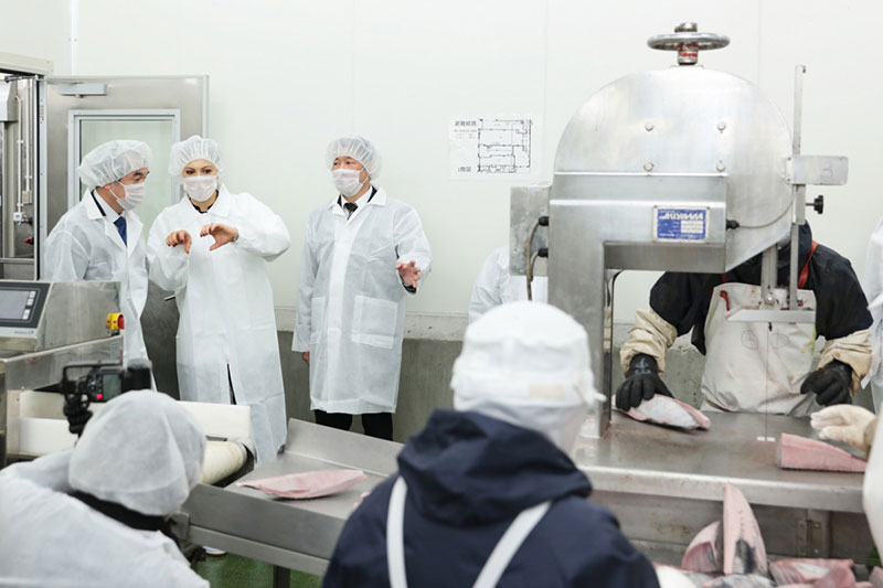 同社が取り組む持続可能な漁業について、松永社長らと懇談した他、カツオタタキなどを手掛ける明豊の加工場も視察されました。