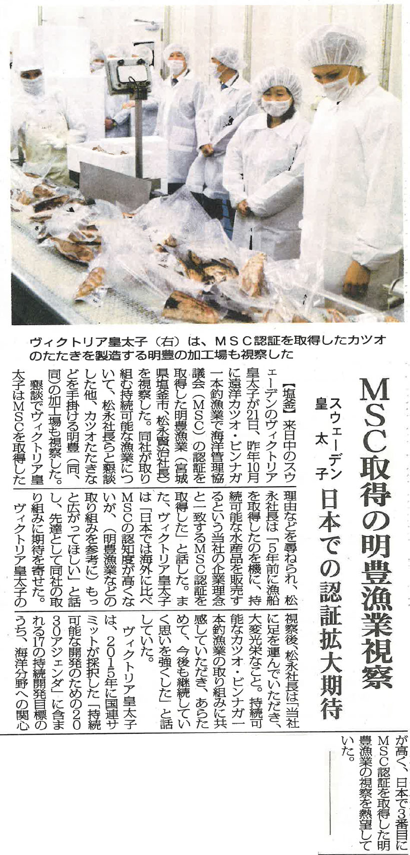 来日中のスウェーデンのヴィクトリア皇太子が21日、昨年10月に遠洋カツオ・ビンナガ一本釣漁業で海洋管理協議会(MSC)の認証をと一致するMSC認証を取得した当社のグループ会社、明豊漁業(宮城県塩釜市、松永賢治社長)を視察されました。