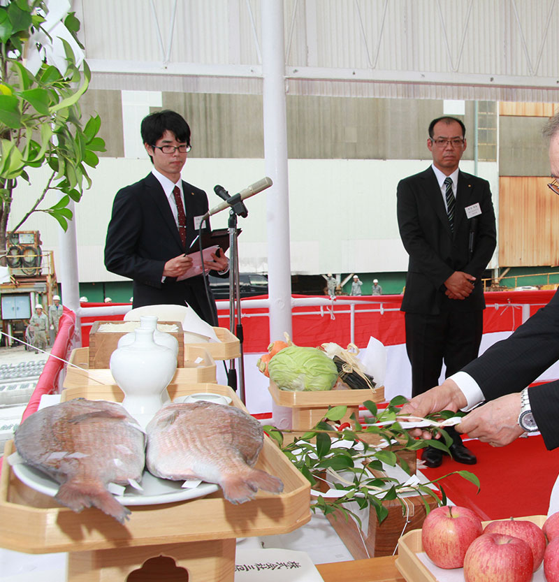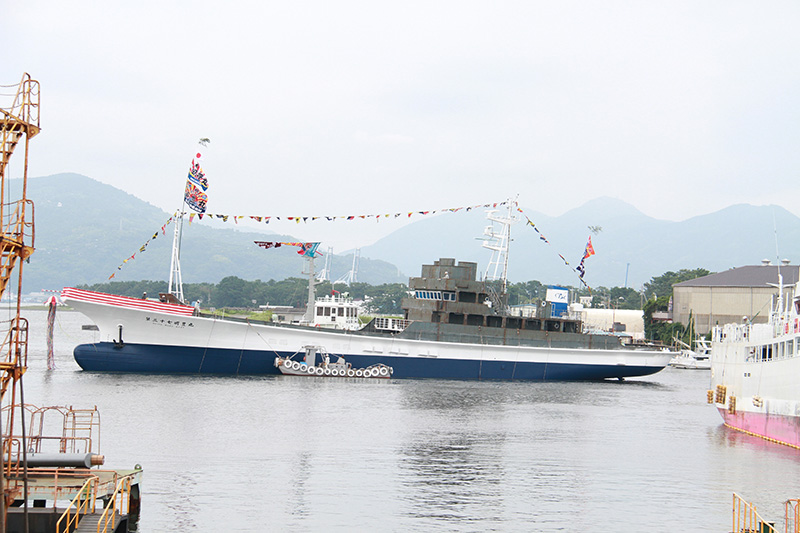 出席者が玉串を捧げ、支綱が切断されると、新船は船台を滑り、駿河湾に浮かびました。