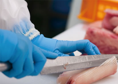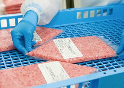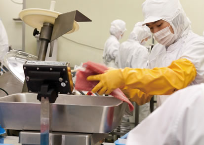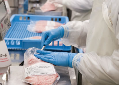 一次加工されたマグロを受け入れ、水槽で殺菌洗浄しながら解凍。トリミングにより迅速に筋を落とします。次に、肉質などが均等になるようバランスを見ながら計量し、つなぎを加えつつサイレントカッターで細切り・混合・練上げます。練上がったネギトロを袋詰めし、空気を抜いてシールします。パックした状態で外観を整えた後、X線に通し、安全性を確認します。その後、凍結庫にて急速凍結を行い、箱詰めし出荷します。また、チルド対応もしています。